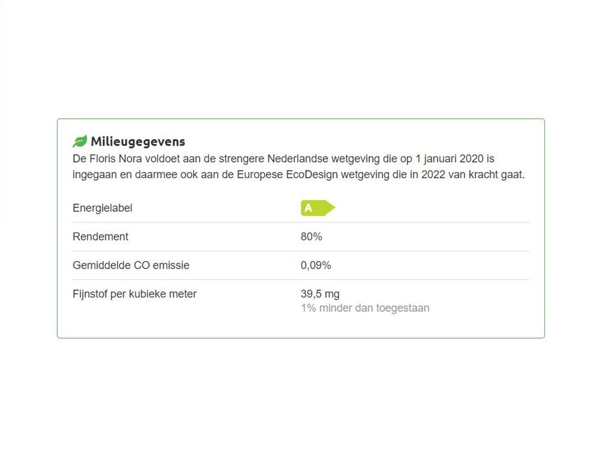 De Floris Nora is een wat grotere houtkachel met een gebogen houtruimte. De kachel is enkelwandig en is daarom snel opgewarmd en straalt veel warmte af. De kachel heeft een vermogen van 8 kW en kan daarom worden geplaatst in grotere ruimtes, maar is ook goed te gebruiken in een buitenruimte of onder een open overkapping.