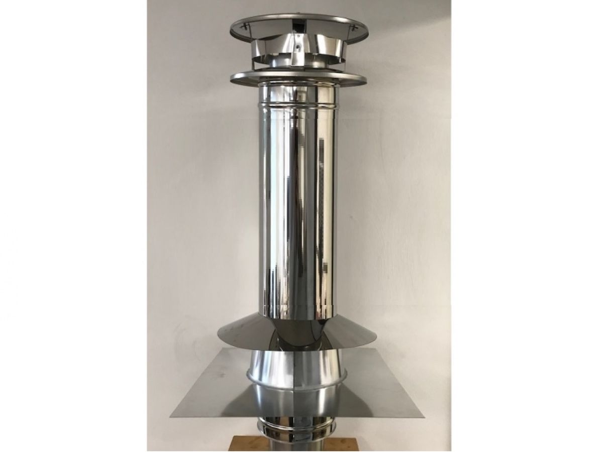 De dubbelwandig geïsoleerde buis voorkomt dat er brandgevaar is bij de doorvoer door het dak. De buitendiameter van de buis is 200 mm, de binnenpijp is 150 mm. Aan de onderkant van de dakdoorvoer zit een verloop van dubbelwandig naar enkelwandige buis, vanaf hier kunt u met enkelwandige buis de kachel aansluiten.